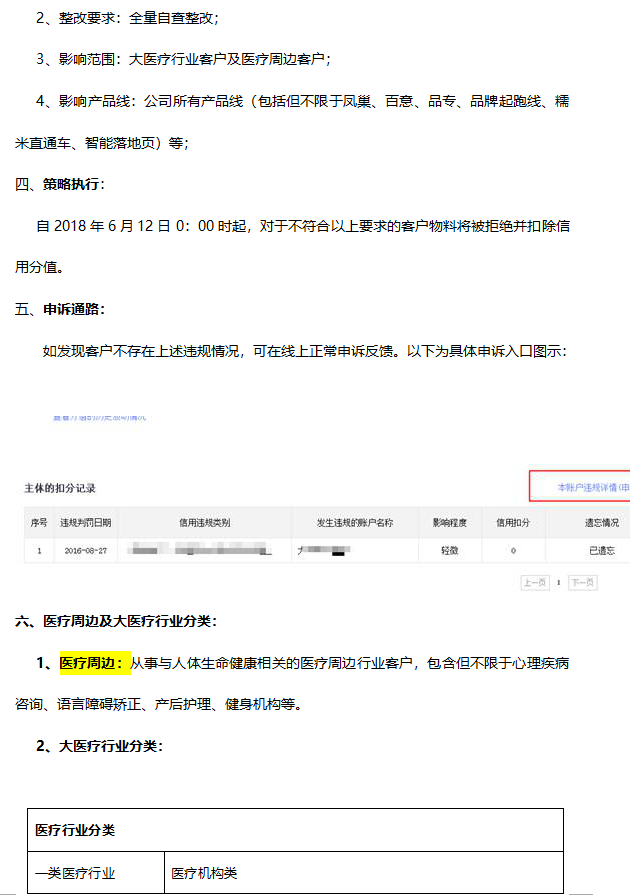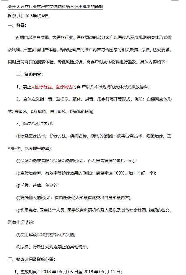 近期總部巡查發(fā)現(xiàn),大醫(yī)療行業(yè)、醫(yī)療周邊的部分客戶(hù)以醫(yī)療八不準(zhǔn)規(guī)則的變體形式投放物料,嚴(yán)重影響用戶(hù)體驗(yàn),為保證客戶(hù)的推廣內(nèi)容符合國(guó)家的相關(guān)政策、法律、法規(guī)要求,同時(shí)提高網(wǎng)民的搜索體驗(yàn),降低風(fēng)險(xiǎn)投訴,需客戶(hù)對(duì)變體物料進(jìn)行整改。
