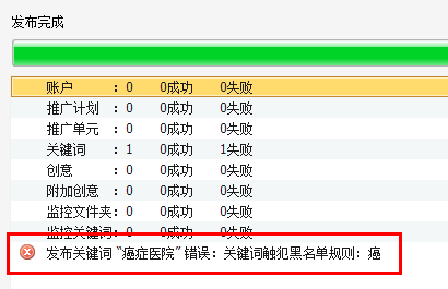 3.如果關(guān)鍵詞觸犯了百度的黑詞,也會(huì)提示錯(cuò)誤。這類情況在肝病、瘤、癌癥等病種最為常見。