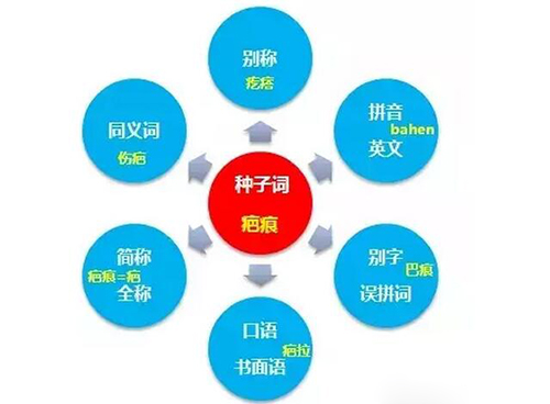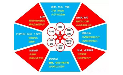 從網(wǎng)民關(guān)注點出發(fā),將六維拓展詞(疤痕)作為種子詞,向八個方向做廣度拓展。這是最常用的一種思路,記得收藏。
