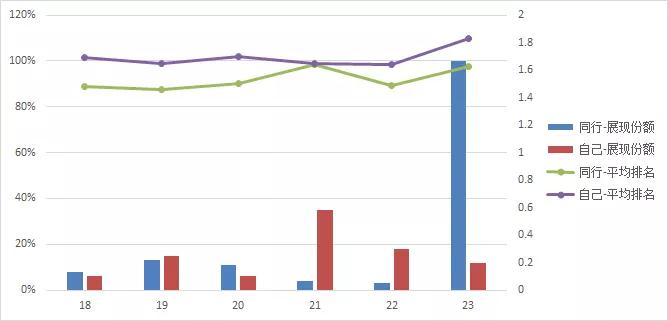 競爭對手23號的展現(xiàn)份額發(fā)生了明顯變化,達到了100%,說明對手做出了一些調(diào)整。