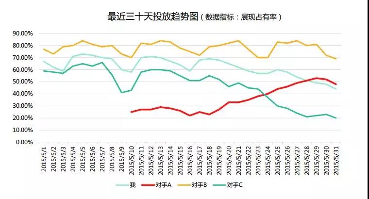 這是9月份的行業(yè)內(nèi)重點關(guān)鍵詞的搜索指數(shù),在18-23號之間,呈現(xiàn)出明顯的增長趨勢,也就是說整個市場的流量是有的。搜索指數(shù)在增加,而展現(xiàn)份額出現(xiàn)變化,說明同行在這段時間內(nèi)加大了推廣。大家在平時的工作中,也可以主要競爭對手的展現(xiàn)份額用圖三樣式做出來,方便對比查看。